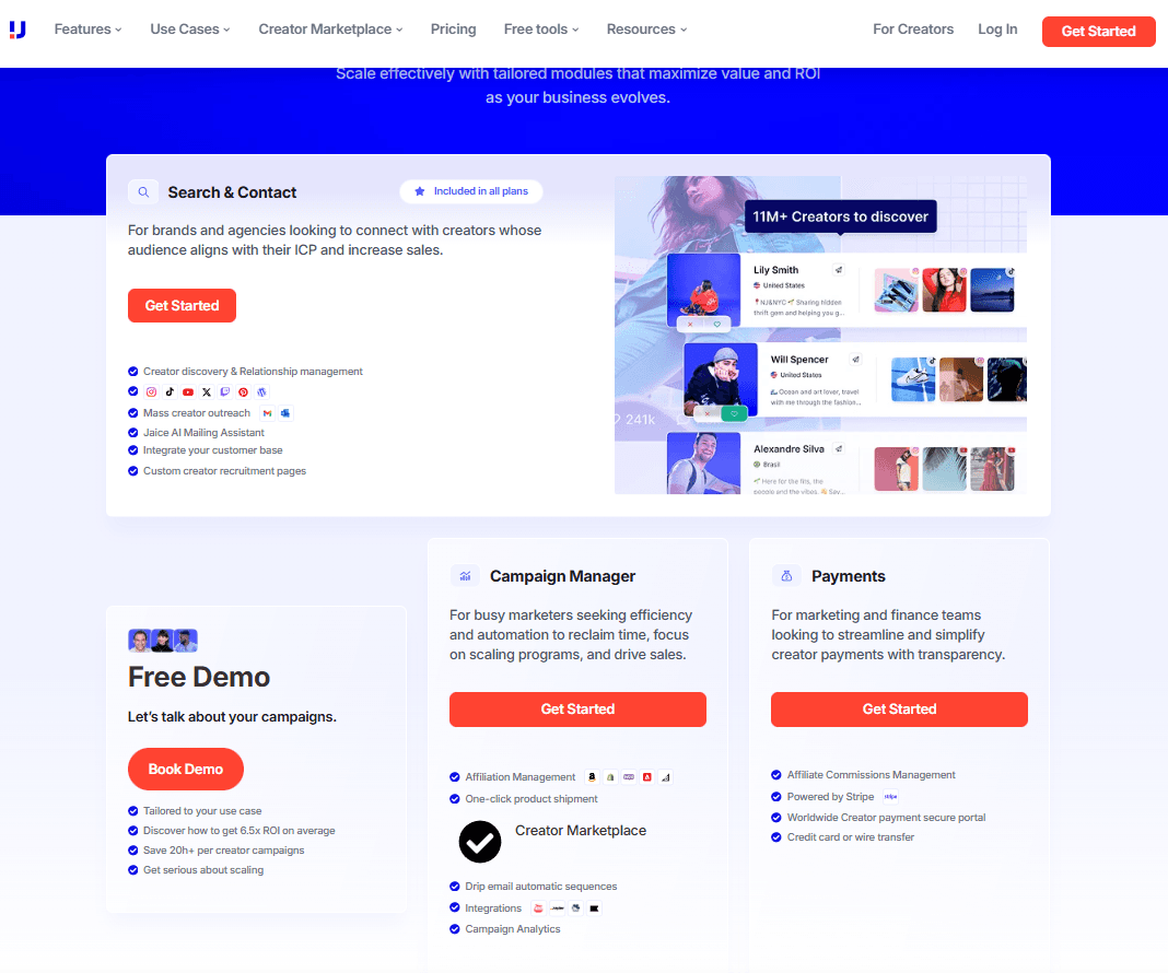 This pricing model is built around feature-based access, where users choose the tools they need, such as creator search, campaign management, or payment processing.